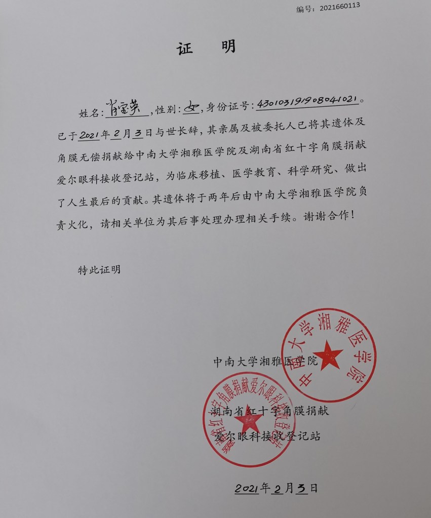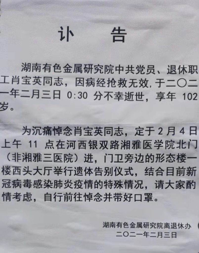 今天我们怀着无比悲痛的心情,代表湘雅医学院来缅怀我们的遗体捐献无语体师、湖南省年龄最长捐献者102岁的肖宝英奶奶。